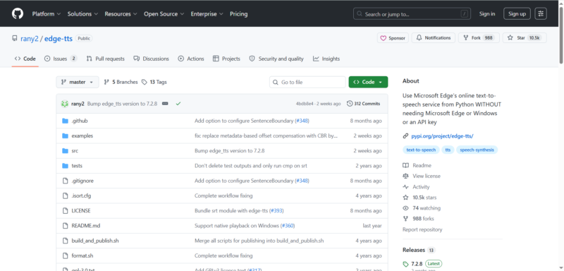 📦 Repo: github.com/rany2/edge-tts — 10.000+ GitHub stars, 40.000+ lượt tải mỗi tuần trên PyPI .