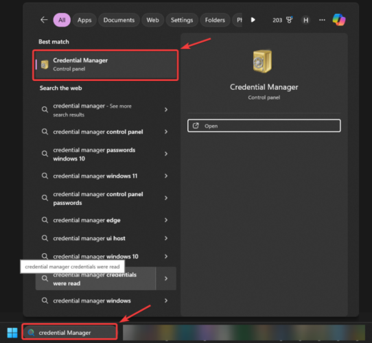 - Bước 1: Nhấn Windows + S, nhập Credential Manager và nhấn Enter.