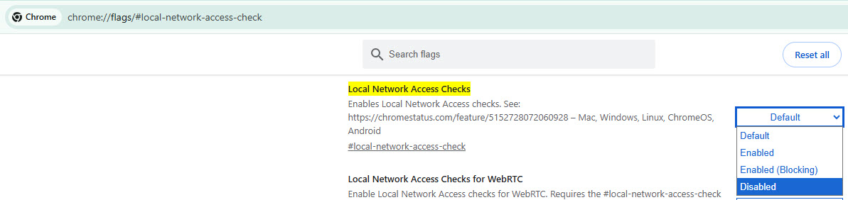 Cách 2: Tắt tính năng Local Network Access Checks trên trình duyệt