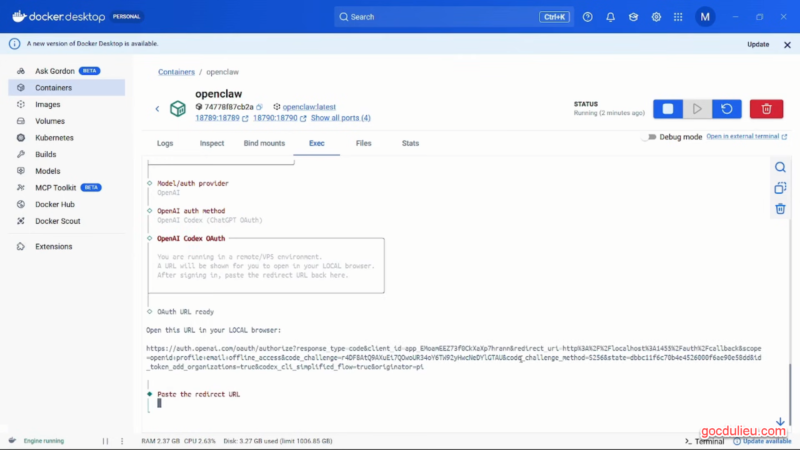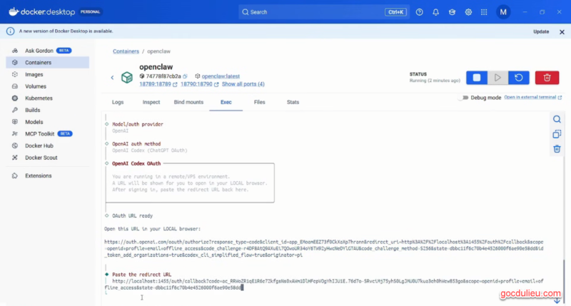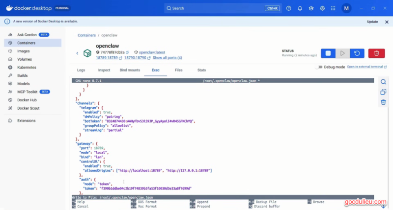 - Trong Docker Desktop, bấm vào tab Exec của container OpenClaw đang chạy.