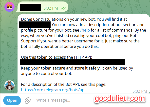 /newbotvà đặt tên cho bot của bạn (ví dụ: OpenClaw). - Đặt Username cho bot (lưu ý: phải kết thúc bằng chữ bot và không được trùng với người khác, ví dụ: gocdulieu_bot).