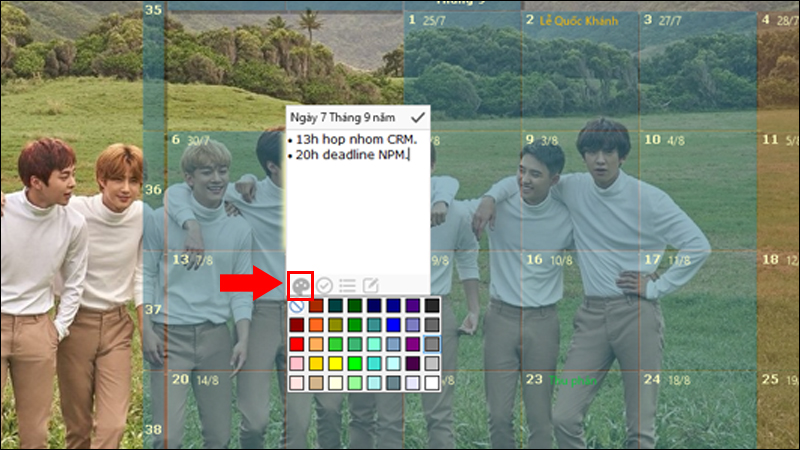 • Đổi màu nền: Nháy đúp vào một ngày, chọn biểu tượng bảng màu và chọn màu sắc bạn muốn để làm nổi bật ngày đó.