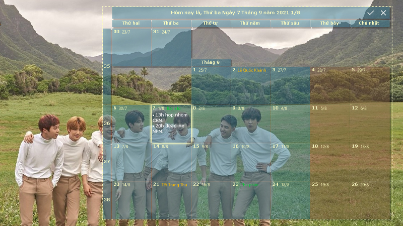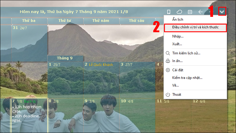 • Thay đổi kích thước và vị trí: Sử dụng tùy chọn “Điều chỉnh” (Adjust) để kéo các góc của khung lịch cho vừa ý hoặc di chuyển nó đến vị trí thuận tiện nhất trên màn hình.