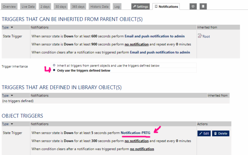 Vào PRTG, khởi động vào một sensor bất kỳ, chọn mục Notification, sau đó gán notification template vừa tạo ở bước 3 để bot gửi tin nhắn qua Telegram.