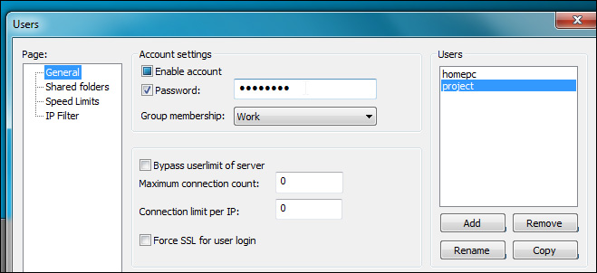 FileZilla Server Interface không chỉ cung cấp cho người dùng sự tiện lợi trong quá trình tạo và quản lý người dùng, mà còn thiết lập quyền đọc hoặc ghi đối với từng tài khoản khác nhau, do vậy người quản lý sẽ hạn chế được việc truy cập trái phép vào những phần tài liệu riêng tư. Bên cạnh đó, chúng ta còn có thể tạo Group – được dùng để kết hợp nhiều tài khoản người dùng có cùng mức phân quyền lại với nhau, và một số thiết lập khác như: giới hạn server, kích hoạt hoặc không sử dụng tính năng SSL khi người dùng đăng nhập, tốc độ truyền tải dữ liệu tối đa…