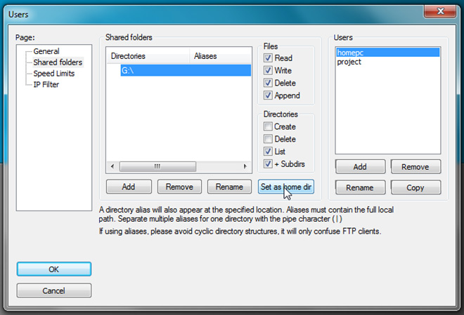Phần Files và Directories cho phép chúng ta xác nhận mức phân quyền đối với các tài khoản người dùng, bao gồm: đọc, ghi, xóa, liệt kê. Ở chế độ mặc định, chương trình sẽ tự động gán quyền tới tất cả các thành phần bên trong thư mục được chia sẻ đó. Tuy nhiên, các bạn có thể tắt bỏ tùy chọn +Subdirs để hạn chế việc truy cập, trong phần Shared Limits là việc thiết lập tốc độ download và upload tối đa đối với từng tài khoản, tùy từng khoảng thời gian trong ngày, và trong phần IP Filter chúng ta có thể loại bỏ các địa chỉ IP cố định: